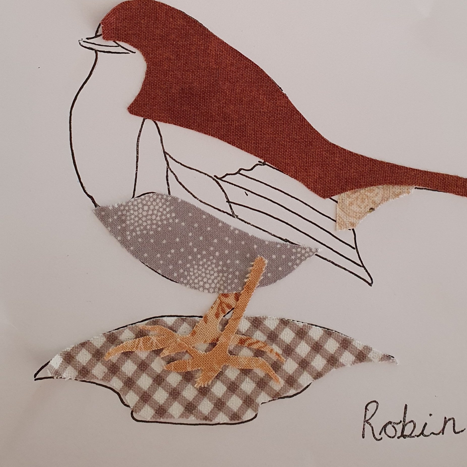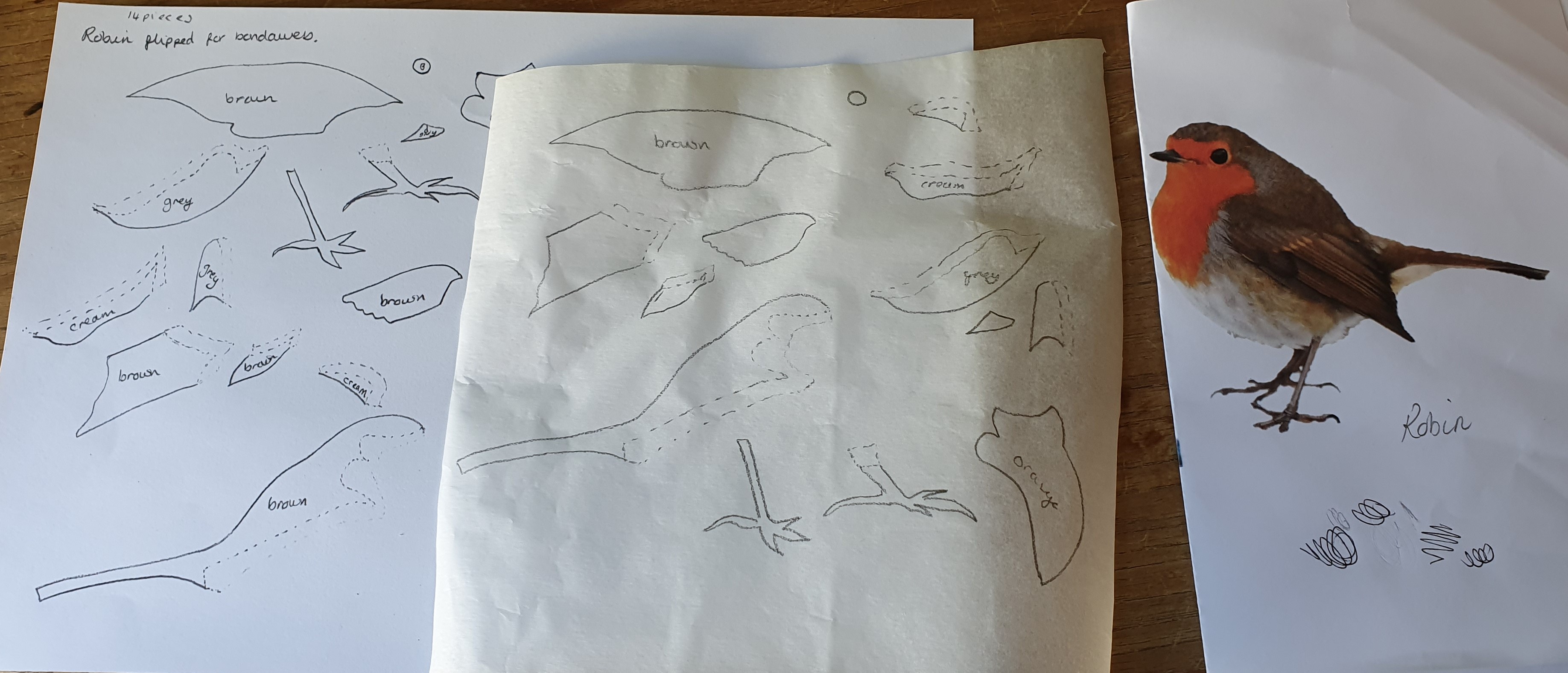 The first step is to make an outline drawing of the bird. Then trace the different shapes you need adding a little bit extra where the fabric will be tucked under. I used my printer to scan and flip the image so that I could trace it onto Bondaweb. Now find the fabrics you want to use, I like a slight pattern on the fabrics rather than plain as it adds texture.