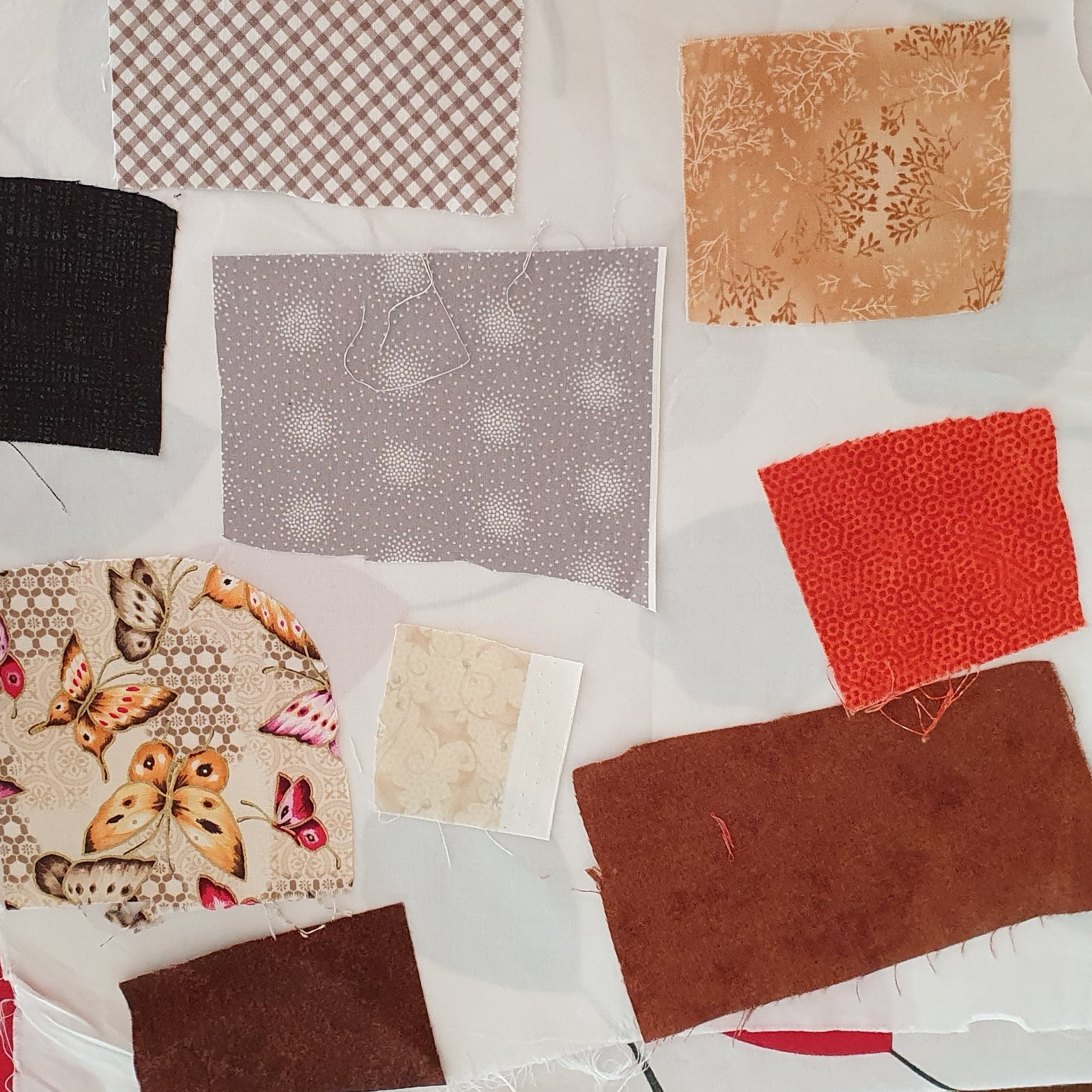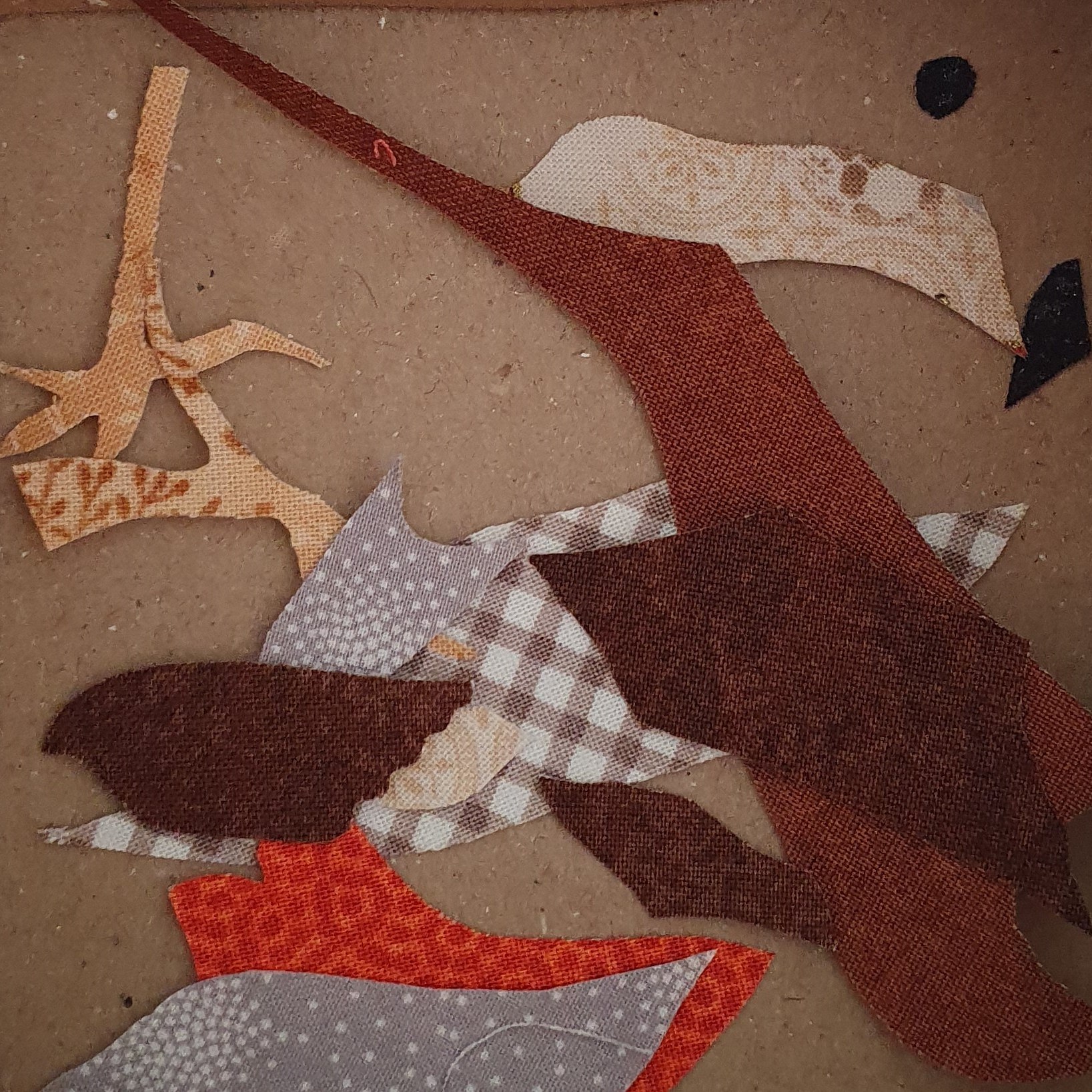 Cut small scraps of each colour, iron on the Bondaweb and cut each piece out before removing the backing paper. I use the original outline picture to aid positioning and a tiny bit of glue to hold the pieces in place. Build up the picture and then carefully lift onto backing fabric and iron the pieces down. You are now reading for a bit of free motion sewing. Lovely!