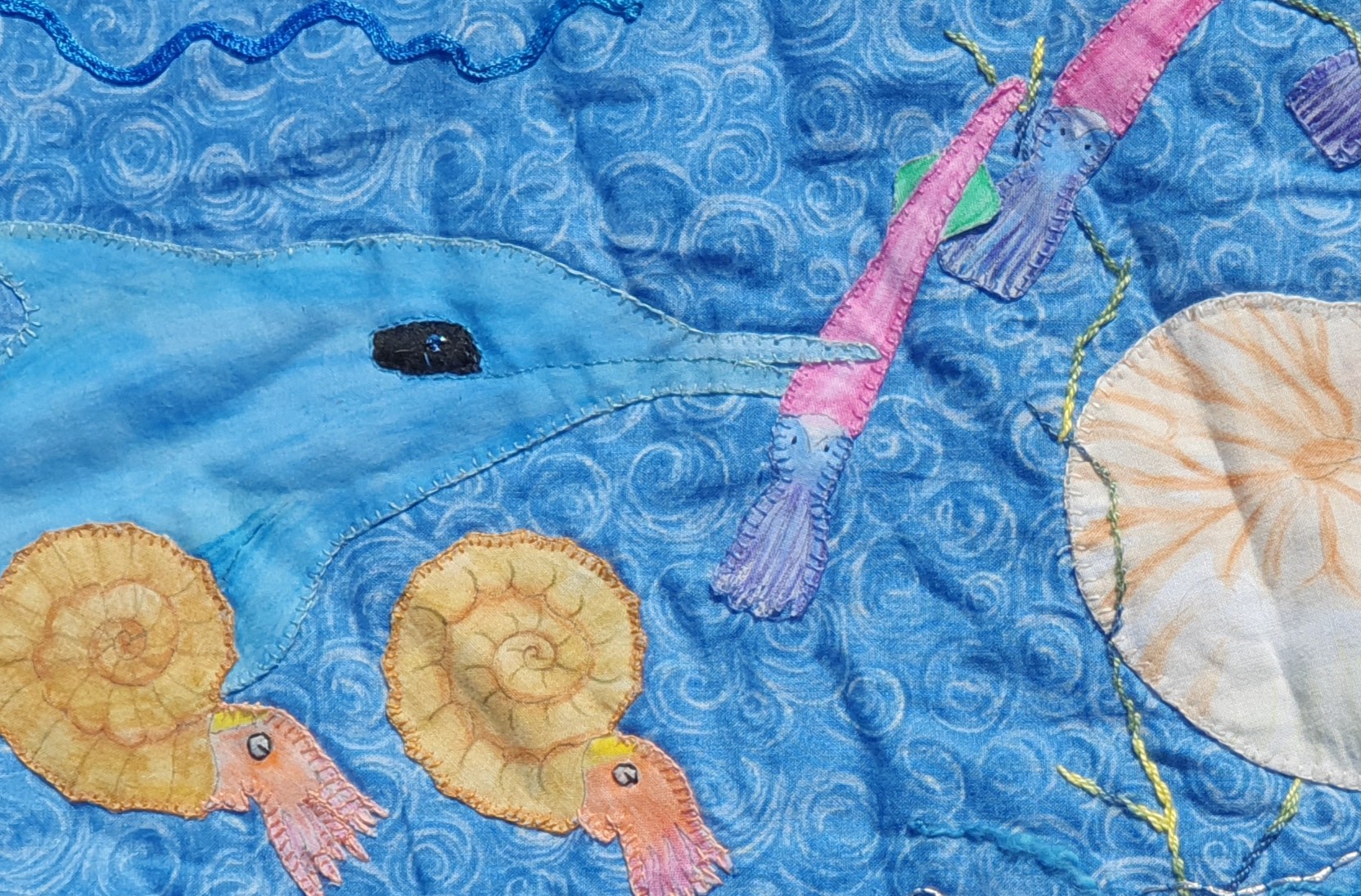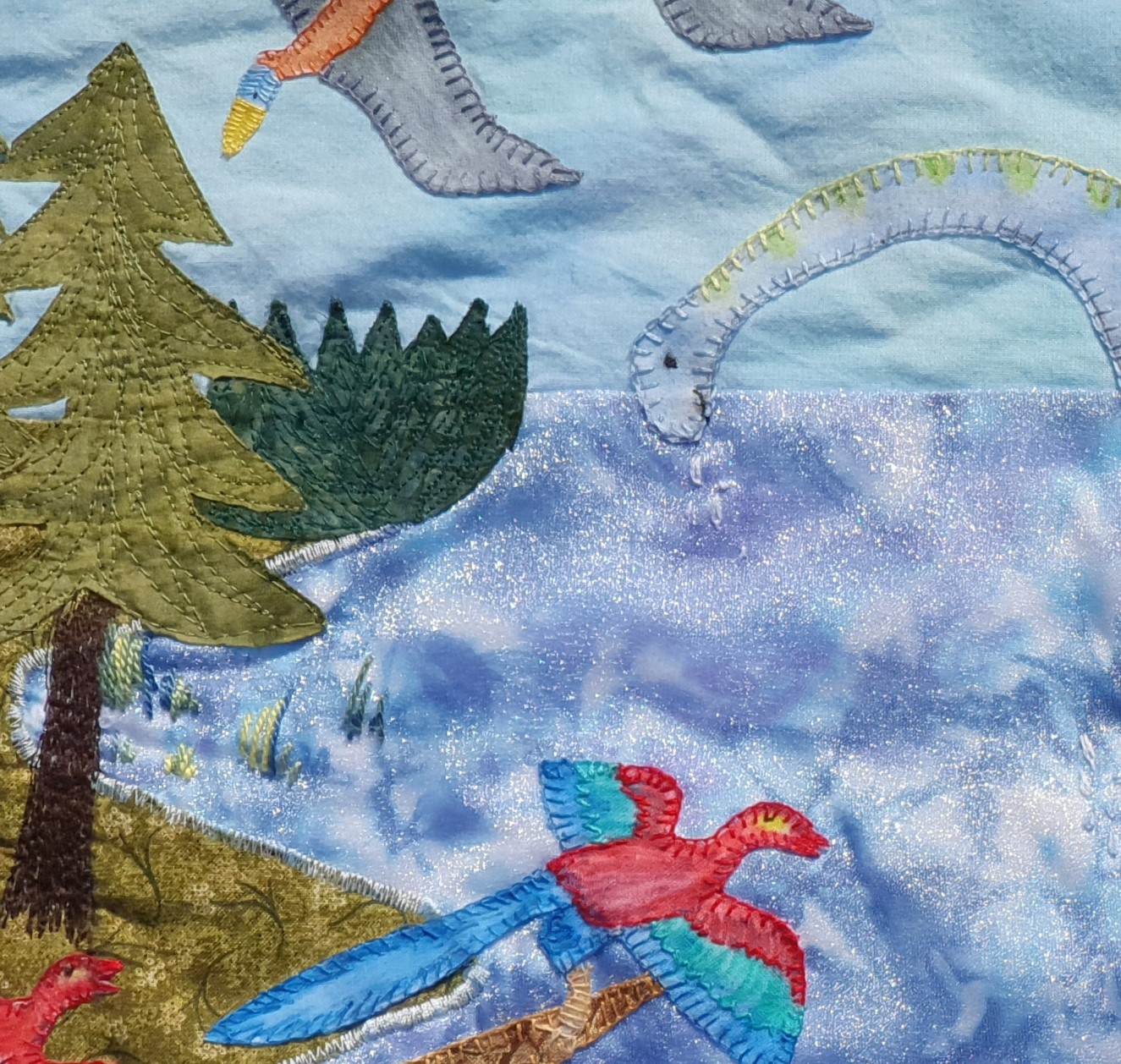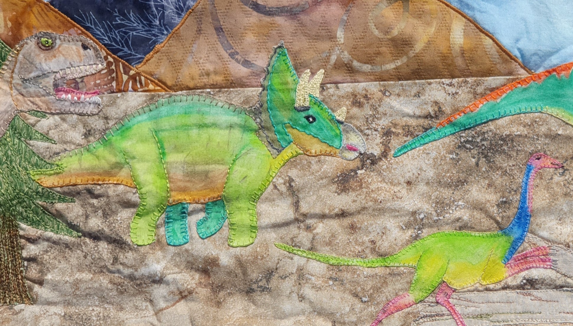 The one above is a portion from the cretaceous period. The creatures have been drawn in a permanent pen and then colour added using Derwent Inktense pencils, with a water and fabric medium wash to make the colours pop out. The creatures are then hand stitched onto the quilt top and wadding before the backing is put on.